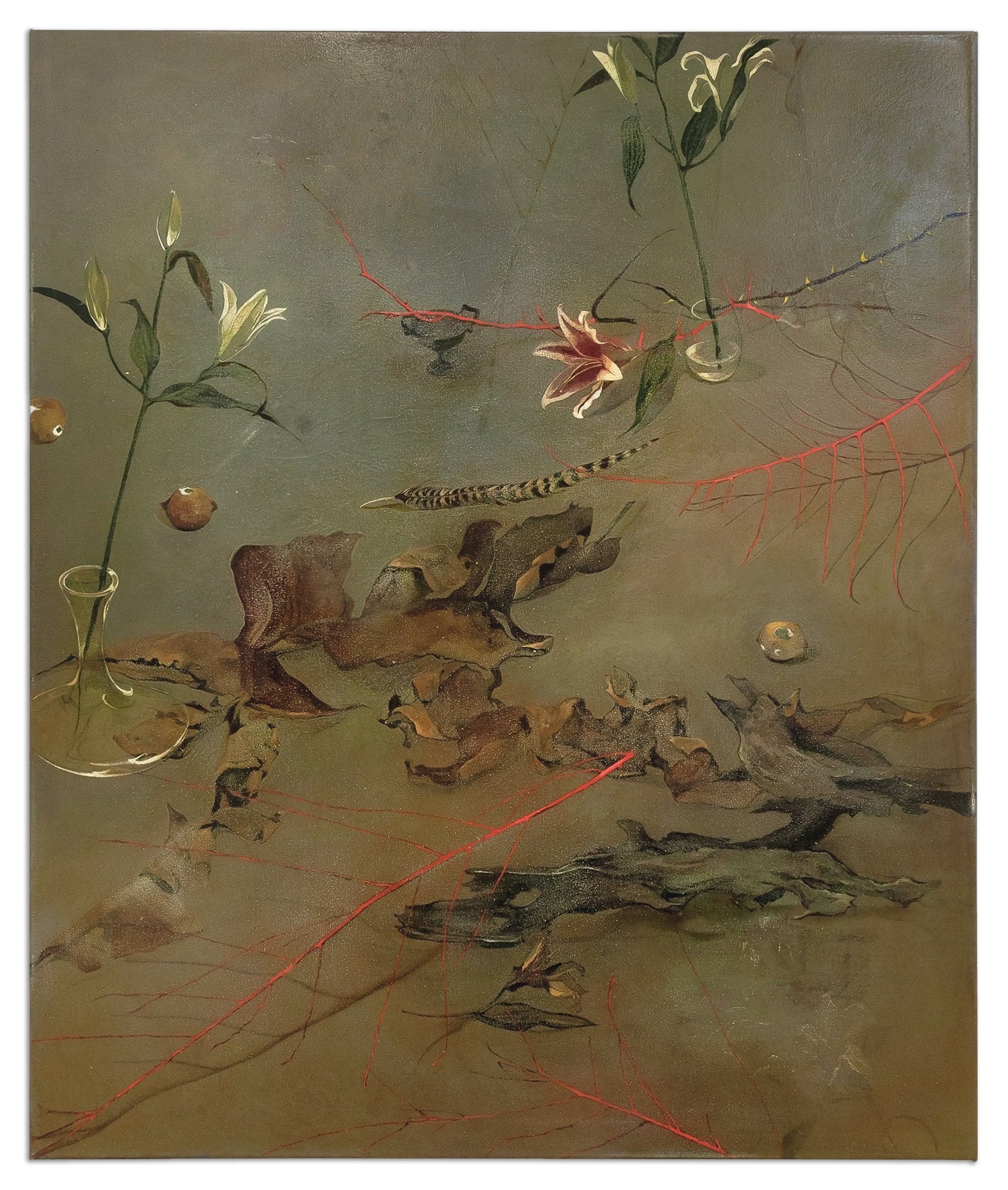 Red Branches (2023) is a large painting that anchors the exhibition. In this exquisite oil work, the titular scattered branches, painted in an intense hue that surpasses nature, share the space with dead leaves as well as cut lilies in clear vessels. Drawing on the theme of the unswept floor in Roman paintings, Anderson creates an assemblage of objects on a greyish color floor. She creates her own garden, one that is not cultivated but rather understood from various viewpoints and over time. The painting represents the artist’s interest in the ordinary, overlooked, or discarded objects that we often fail to consider. Her research into object-oriented ontology, which purports that objects exist independently of human perception, but are intrinsically linked to ecology and the future of our planet, is also evident here.